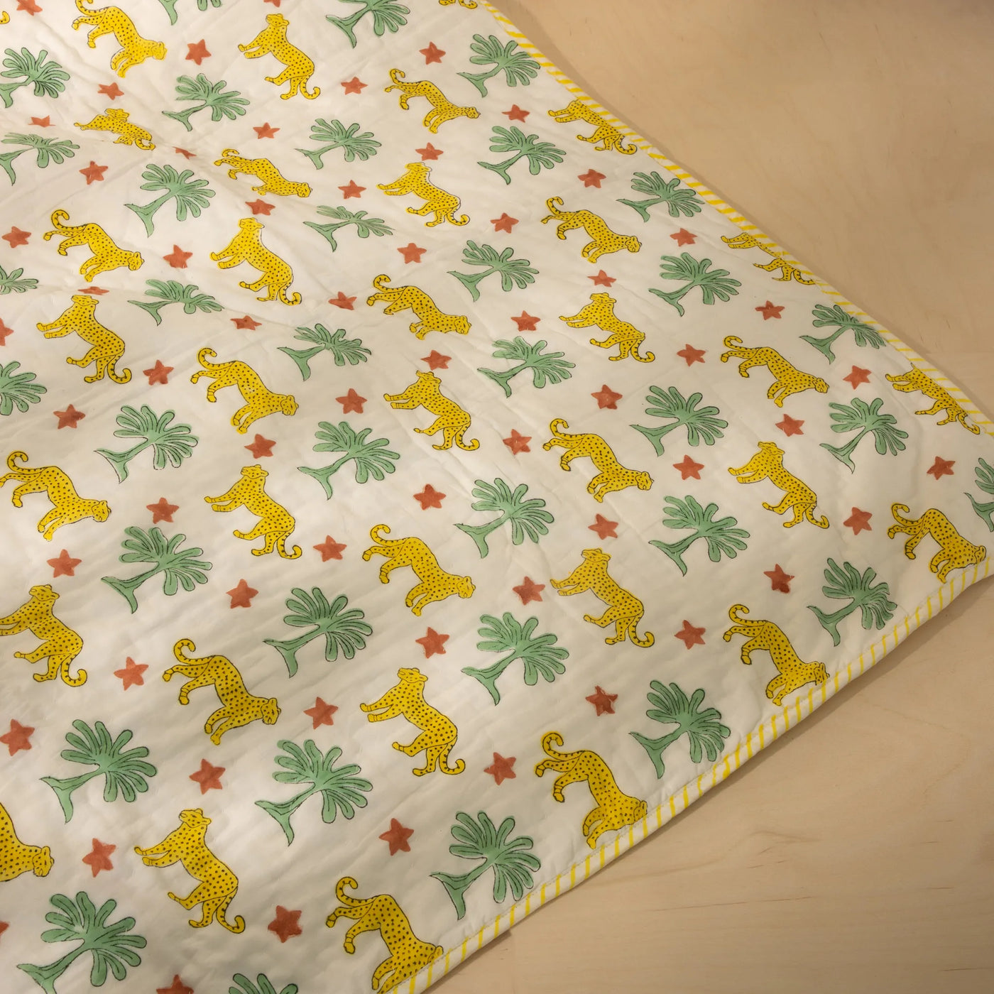 Wrap your child in comfort with this Safari Print Muslin Cotton Quilt. Thoughtfully handcrafted with mulmul cotton and organic cotton filling, it is lightweight, breathable, and reversible for year-round use. Featuring playful jungle motifs of cheetahs, palms, and stars, this quilt is as cozy as it is stylish. • Fabric: Premium mulmul cotton • Filling: Organic cotton • Craft: Hand block printed with azo-free natural colours • Reversible & hand-stitched • Size: 102 x 152 cm (40 x 60 inch) • Ethically handcrafted in India