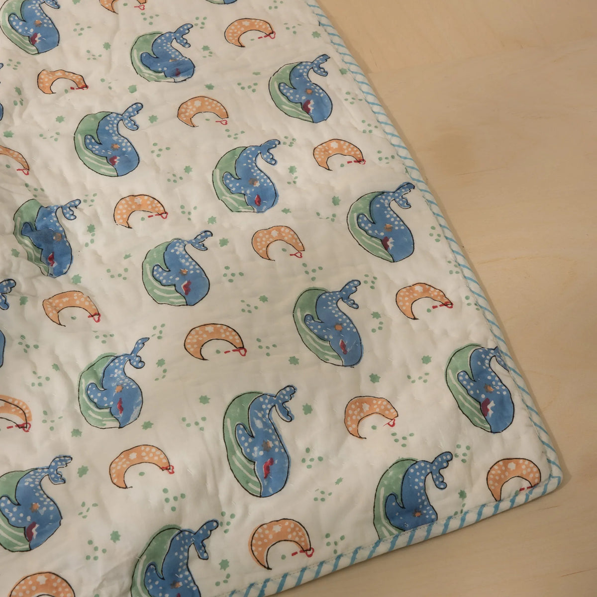 Drift into dreamland with our Whale & Moon Muslin Cotton Quilt. Crafted with premium mulmul cotton and organic cotton filling, this reversible quilt is lightweight, breathable, and perfect for kids. The hand block printed nautical theme with cheerful whales, moons, and stars makes bedtime extra fun. • Fabric: Premium mulmul cotton • Filling: Organic cotton • Craft: Hand block printed with azo-free natural colours • Reversible & hand-stitched • Size: 102 x 152 cm (40 x 60 inch) • Ethically handcrafted in India