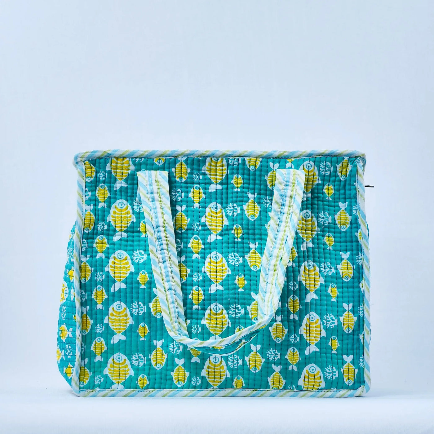 Crafted from cotton waffle fabric, this vibrant quilted tote bag features a playful yellow fish pattern on a teal base. It includes sturdy padded handles, a secure zip closure, and roomy compartments for daily or travel essentials. Lightweight yet long-lasting, it’s perfect for kids’ trips, beach outings, or as a stylish carryall.