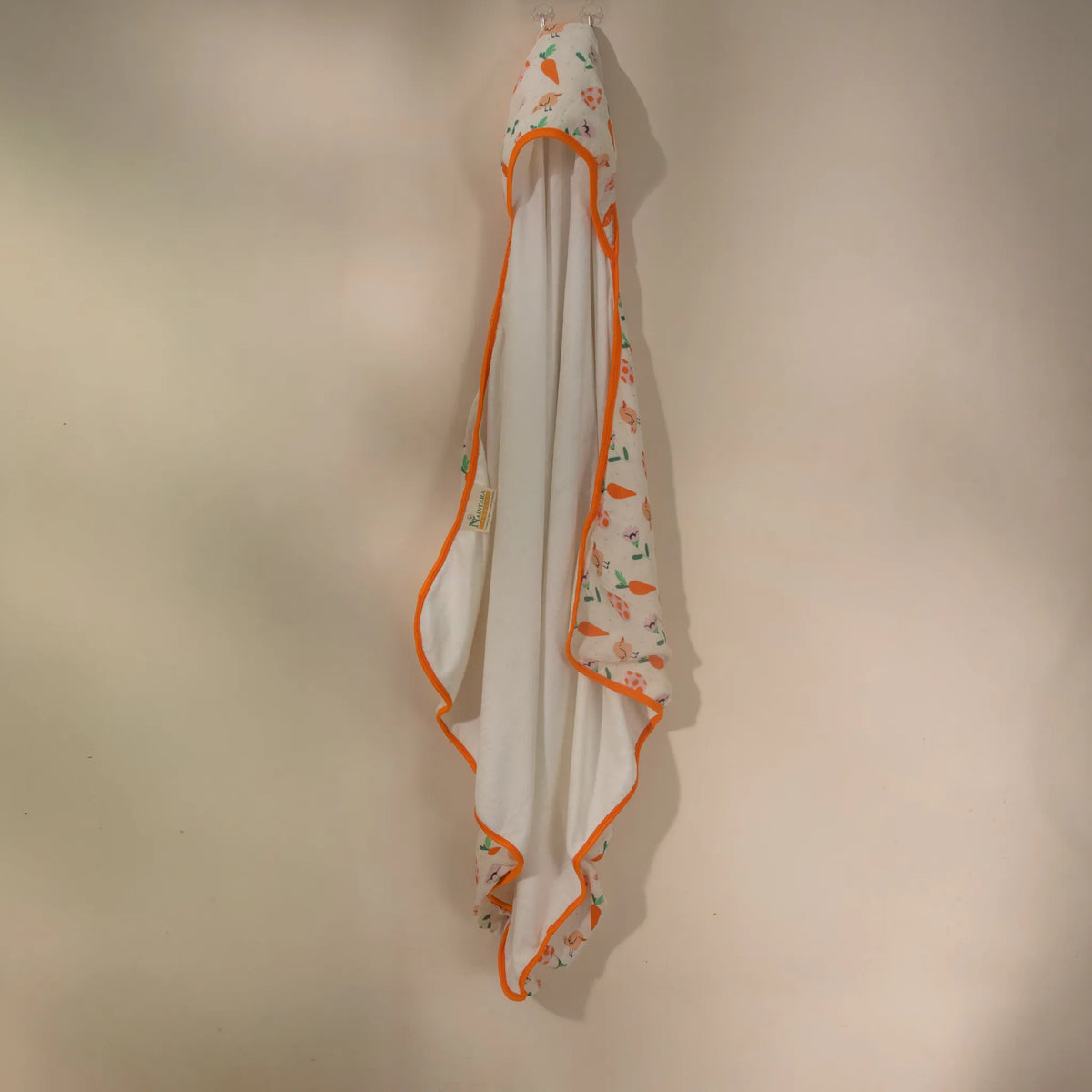 Tiny Carrot Crunchers Baby Hooded Bath Towel. Made from ultra-soft, breathable organic cotton, this towel is designed to be gentle on delicate baby skin while offering excellent absorbency.